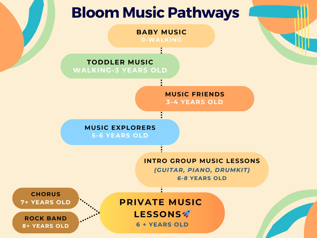 Bloom’s music program is designed to support musicians from the age of 0 to adults.Students may begin their musical journey at any time and are welcome to explore all age appropriate music lessons and classes.